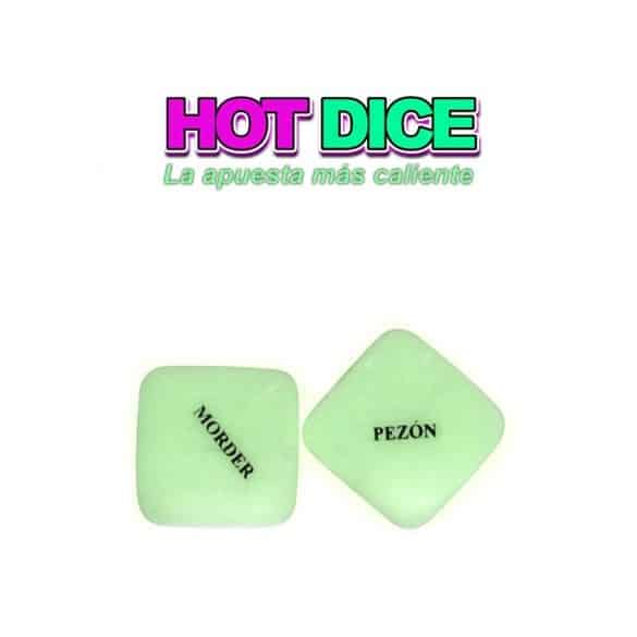 Dados eróticos que brillan en la oscuridad. Contienen palabras que señalan la acción a realizar y el lugar del cuerpo.